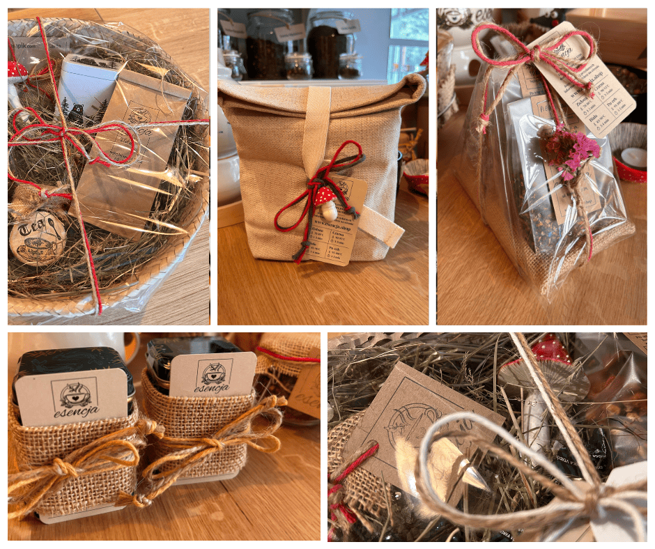 Kiedy przygotowujemy dla Was prezent, macie wiele możliwości wyboru opakowania. Może to być pudełko, uroczy koszyk, minimalistyczna podstawka papierowa lub efektowne zapakowanie w sam celofan. Herbaty mogą być umieszczone w słoiczkach, puszkach, dostępnych u nas pojemnikach lub naturalnych papierowych lub przezroczystych opakowaniach. Wybór zależy od Waszej kreatywności i preferencji osoby obdarowywanej.