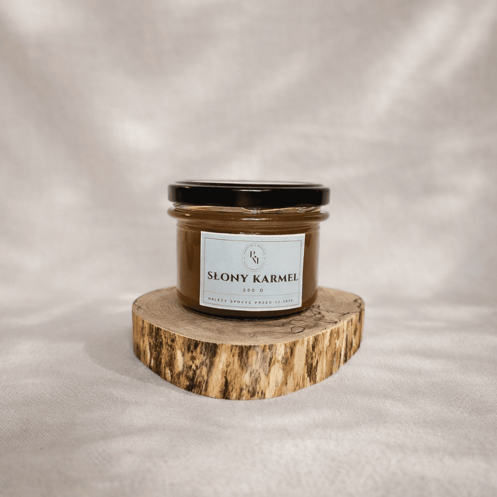 Słony karmel z pracowni Pieczone z Miłością to klasyczny, rzemieślniczy karmel przygotowywany z prostych, wysokiej jakości składników. Ma gęstą, kremową konsystencję oraz wyraźnie maślany smak przełamany dodatkiem soli.