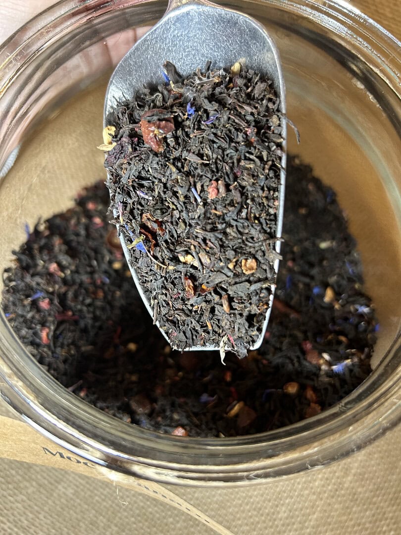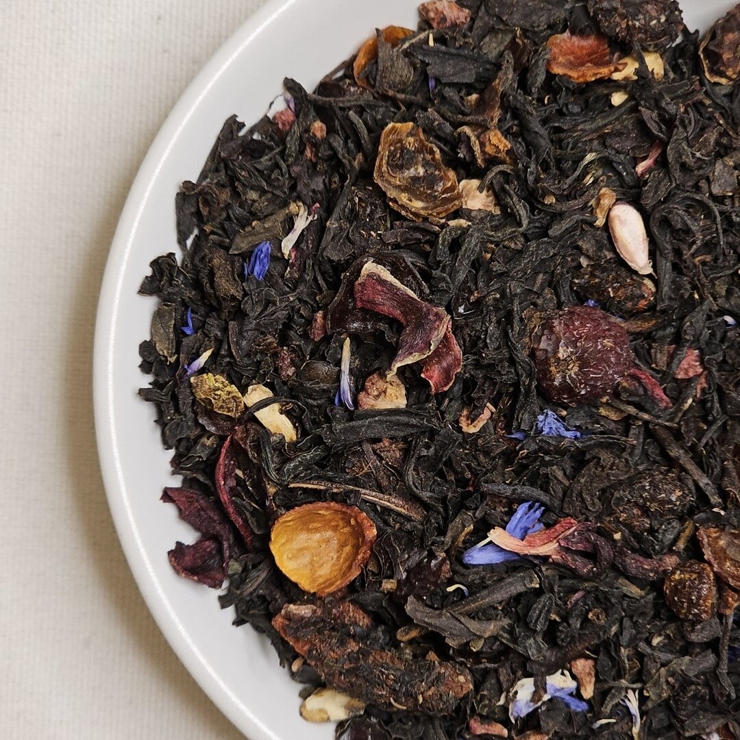 Moc Granatu to intensywna czarna herbata z ziarenkami granatu, malinami, jagodami goji, hibiskusem, dziką różą, rokitnikiem, guaraną i płatkami bławatka – owocowo-kwiatowa mieszanka o energetyzującym charakterze, pełna słodyczy, aromatu i naturalnej świeżości.